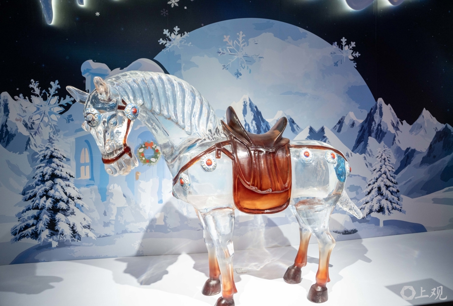 亚克力雕塑“马上发财”吸引了不少观众驻足,该雕塑参考原型为“唐三彩马”。