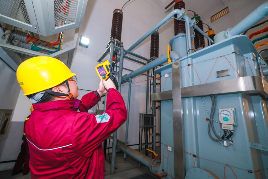 申城正值今冬电力保供关键期。1月12日,国网上海松江供电公司工作人员前往佘山110千伏步泾变电站,对站内供电线路和核心电气设备开展全方位检查。